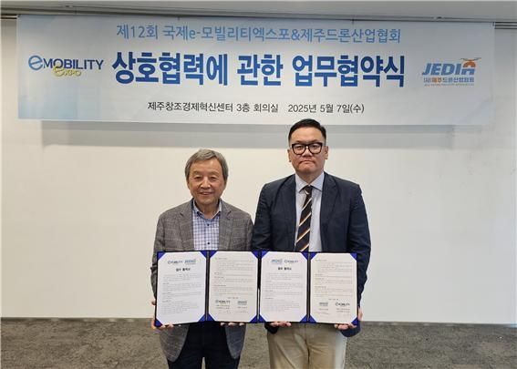 국제 e-모빌리티엑스포 조직위원회는 제주드론산업협회와 지속가능한 드론분야 산업생태계 조성과 정보교환, 엑스포 성공을 위한 업무협약을 7일 맺었다고 밝혔다.