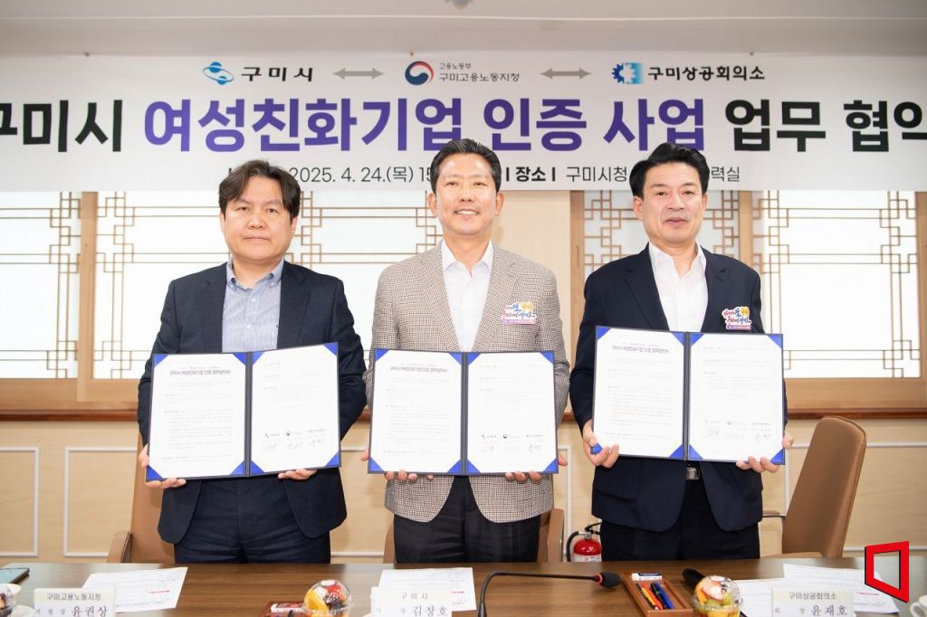 (좌)윤권상 노용노동부 구미지정장 (중앙)김장호 구미시장 (우)윤재호 구미상의회장](구미시 여성친화기업 인증 사업 업무 협약식
