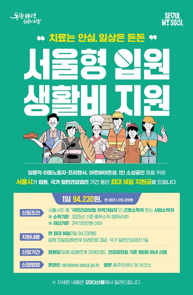 '서울형 입원생활비' 지원제도는 일용직, 이동노동자, 프리랜서, 아르바이트생 등 고용이 불안정한 노동자들에게 치료에 집중할 수 있도록 입원생활비를 지원하는 사업이다.