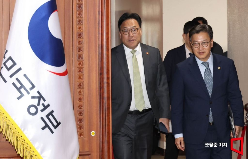 김범석 기획재정부 장관 직무대행(오른쪽)과 김병환 금융위원장(왼쪽)이 8일 서울 종로구 정부서울청사에서 열린 경제관계장관회의에 참석하고 있다.