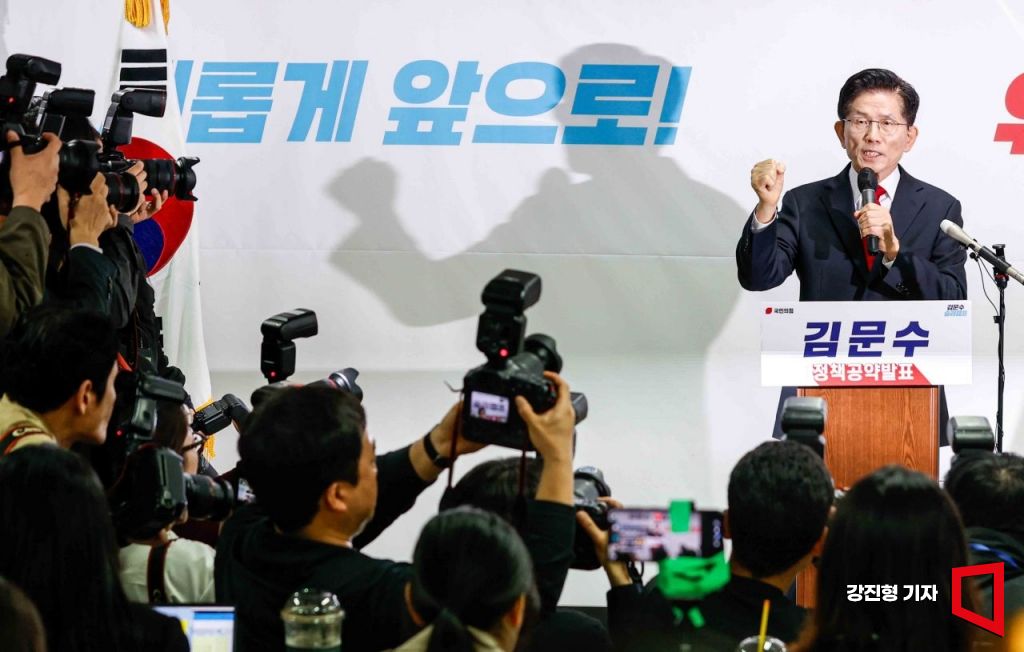 김문수 국민의힘 대선후보가 8일 서울 여의도 선거캠프에서 긴급 기자회견을 하고 있다.