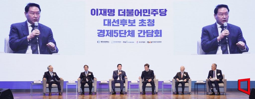최태원 대한상공회의소 회장이 8일 서울 중구 대한상공회의소에서 열린 이재명 더불어민주당 대선후보 초청 경제5단체 간담회에서 정책 제언을 하고 있다. 2025.5.8 국회사진기자단
