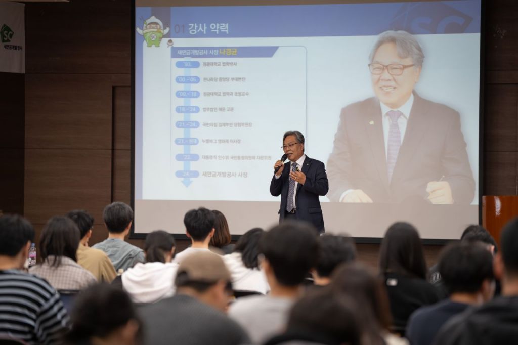 나 사장은 '전북특별자치도, 그리고 미래 천년을 준비하는 새만금'이라는 주제로 강연을 펼쳤다. 특히, 이번 강연에서 새만금 개발의 정책적 배경과 공간 전략, 공기업이 지역 발전에서 수행하는 핵심적 역할, 그리고 미래 인재에게 요구되는 핵심 역량 등을 풍부한 현장 경험을 바탕으로 심도 있게 설명했다.