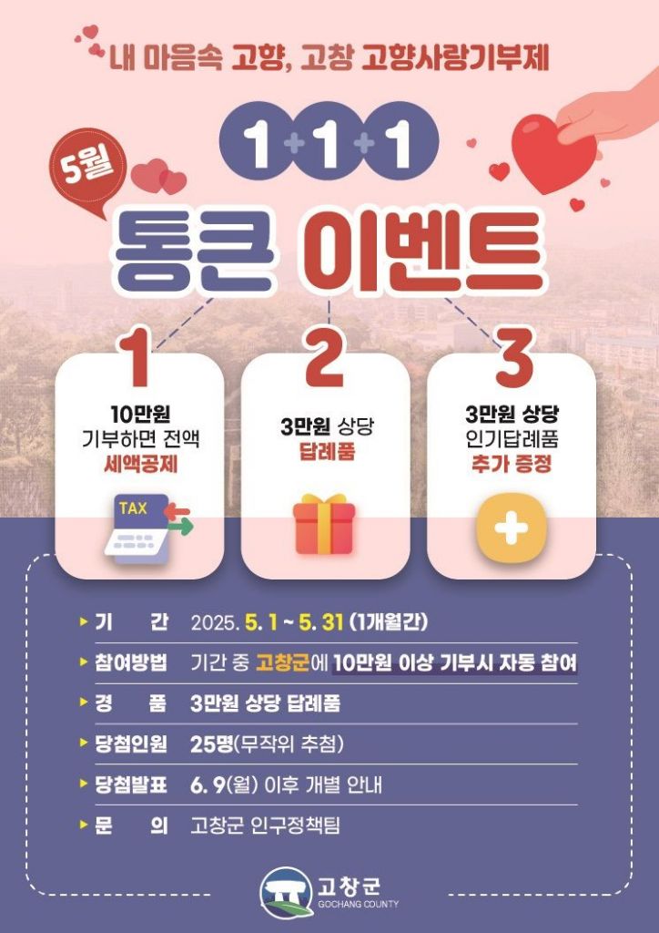전북 고창군이 5월 가정의 달을 맞아 고향사랑기부제에 많은 분들의 참여 독려·풍성한 혜택 제공을 위해 '5월 1+1+1 통큰이벤트'를 진행한다.