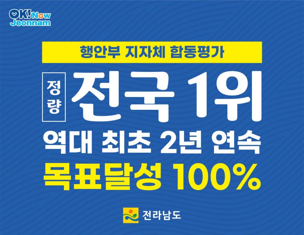 전라남도는 8일 행정안전부의 2025년(2024년 실적) 지자체 합동 평가 결과 정량 지표에서 2년 연속 100%로 1위를 달성했다고 밝혔다.