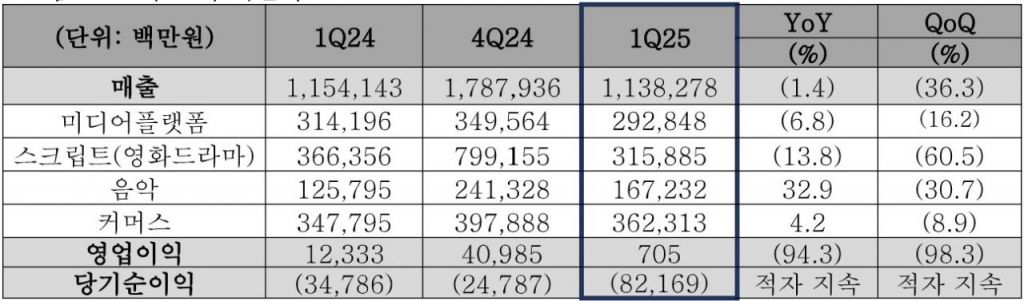 스크립트 콘텐츠(영화 드라마) 부문 매출은 해외 유통 매출 감소로 1년 전 같은 기간보다 13.8% 감소한 3159억원, 영업손실은 232억원을 나타냈다. 음악 부문은 매출 1672억원, 영업이익 27억원을 각각 기록했다.
