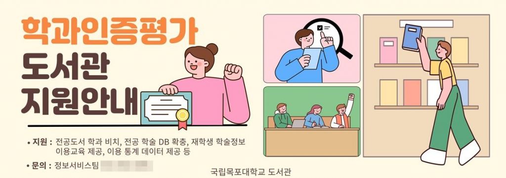 '학과인증평가 지원 서비스'는 올해 상반기부터 시행 중이며, 관련 문의는 국립목포대학교 도서관 정보서비스팀으로 하면 된다.