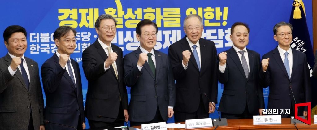 이재명 더불어민주당 대표와 류진 한국경제인협회 회장을 비롯한 참석자들이 5일 국회에서 열린 '더불어민주당-한국경제인협회 민생경제 간담회'에서 기념촬영을 하고 있다. 김현민 기자