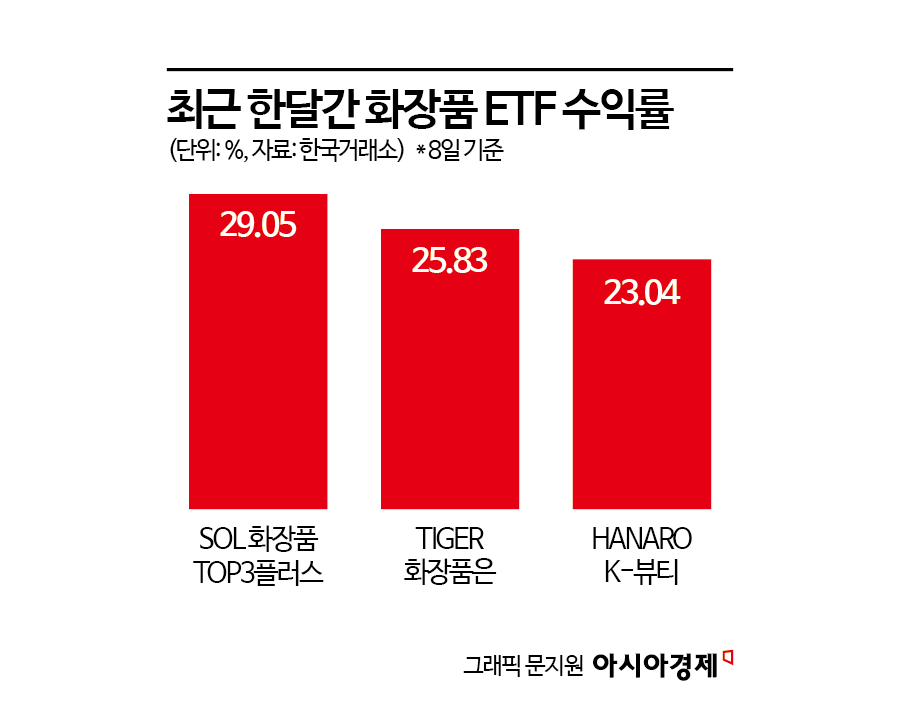 9일 한국거래소에 따르면 최근 한 달간 SOL 화장품TOP3플러스는 29.05% 상승했다. 이와 함께 TIGER 화장품은 25.83%, HANARO K-뷰티는 23.04% 각각 올랐다.