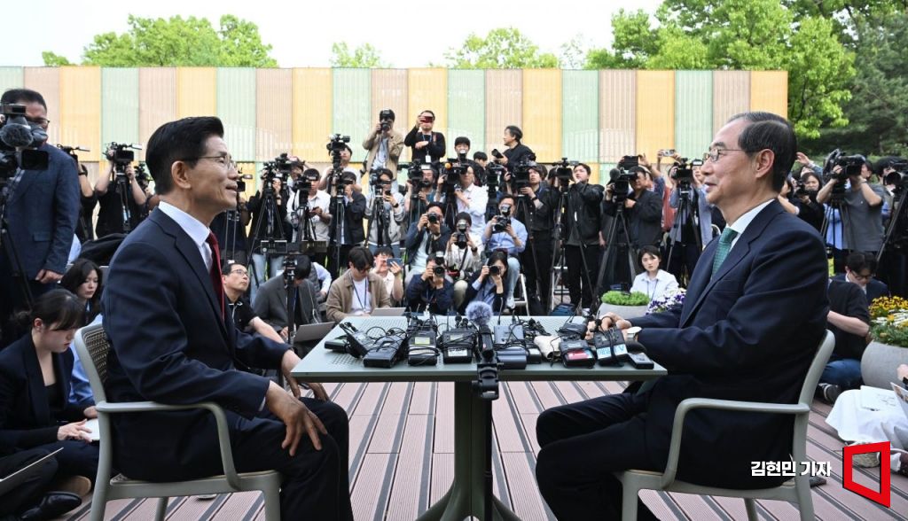 김문수 국민의힘 대선 후보와 한덕수 무소속 대선 예비후보가 8일 국회 강변서재에서 후보 단일화 관련 회동을 하고 있다.