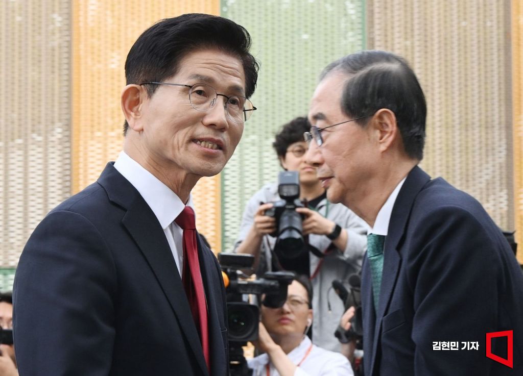 김문수 국민의힘 대선 후보와 한덕수 무소속 대선 예비후보가 8일 국회 사랑재에서 만나 후보 단일화를 위한 2차 회동을 마친 뒤 이석하고 있다.
