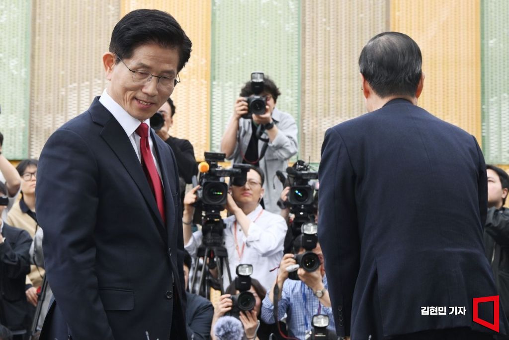 김문수 국민의힘 대선 후보와 한덕수 무소속 대선 예비후보가 8일 국회 사랑재에서 만나 후보 단일화를 위한 2차 회동을 마친 뒤 이석하고 있다.