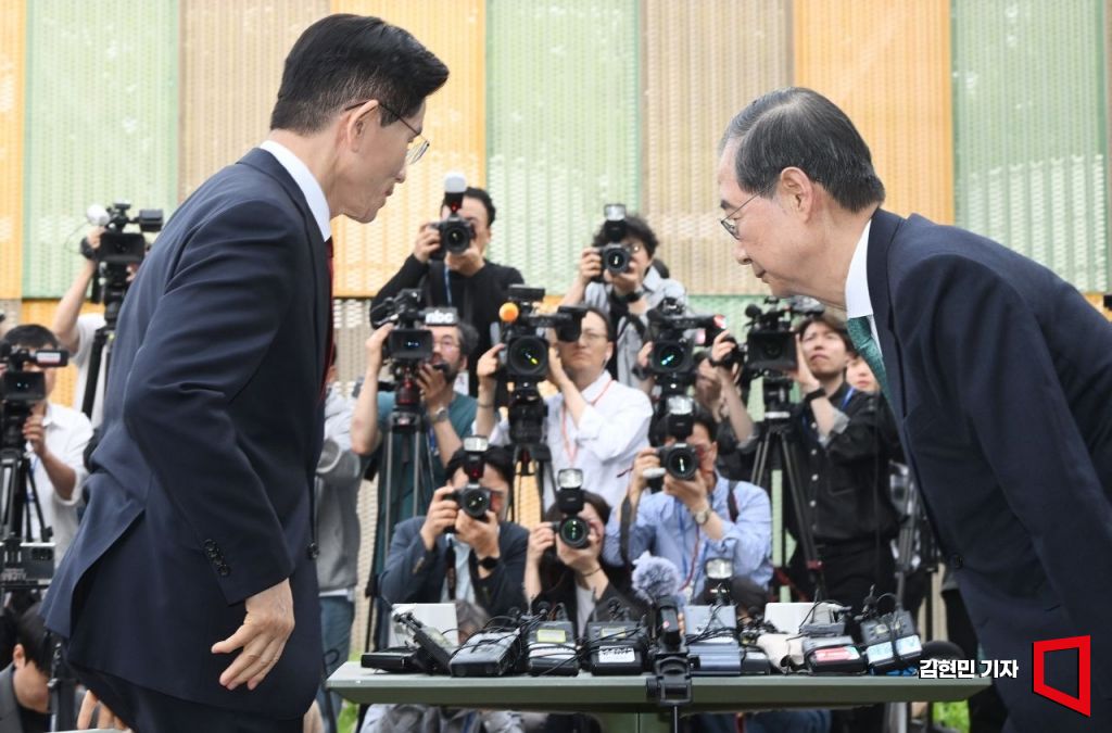 김문수 국민의힘 대선 후보와 한덕수 무소속 대선 예비후보가 8일 국회 사랑재에서 만나 후보 단일화를 위한 2차 회동을 마친 뒤 이석하고 있다.