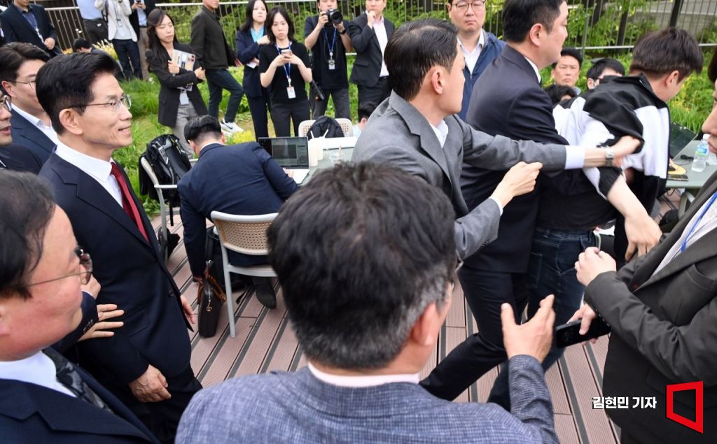 김문수 국민의힘 대선 후보가 한덕수 무소속 대선 예비후보와의 단일화를 위한 2차 회동을 하기 위해 8일 국회 사랑재로 향하던 중 한 후보의 지지자가 김 후보에게 항의하자 관계자들이 저지하고 있다.