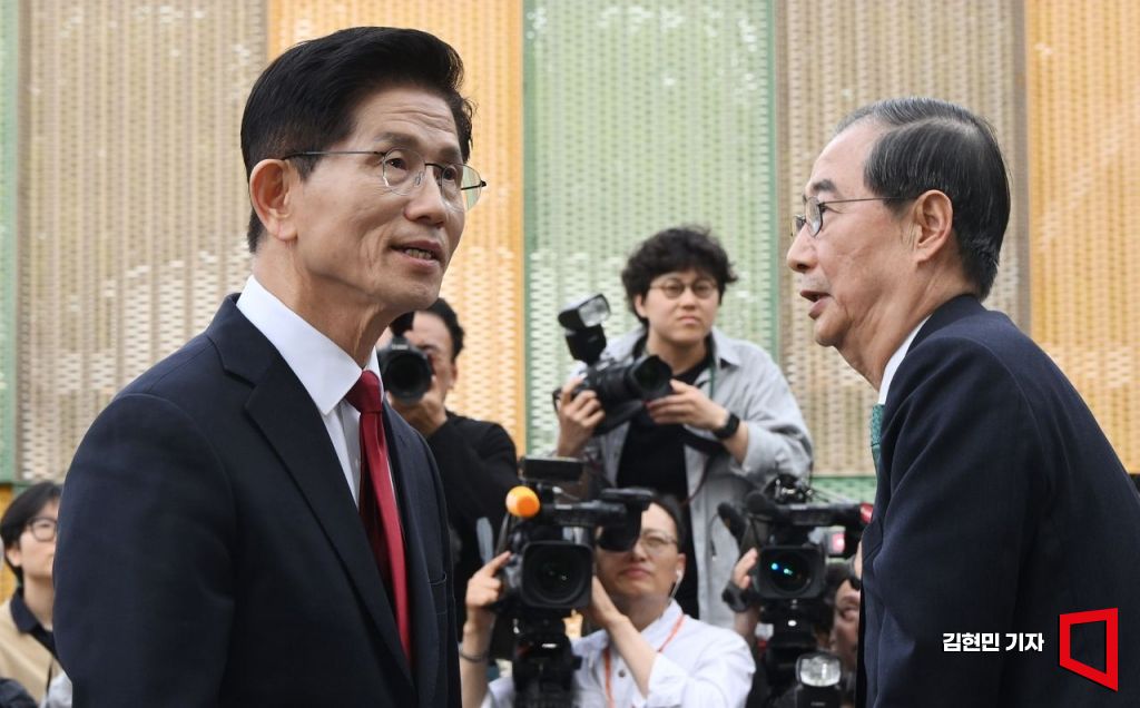 김문수 국민의힘 대선 후보와 한덕수 무소속 대선 예비후보가 8일 국회 사랑재에서 만나 후보 단일화를 위한 2차 회동을 마친 뒤 이석하고 있다.