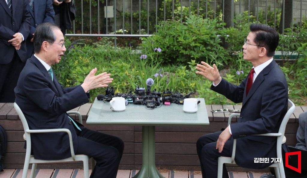 김문수·한덕수 후보는 8일 오후 4시30분 서울 여의도 국회 사랑재 야외 테이블에서 회동을 갖고 1시간여 동안 단일화 문제를 논의했다. 회담은 사전 합의에 따라 전체 생중계됐다.