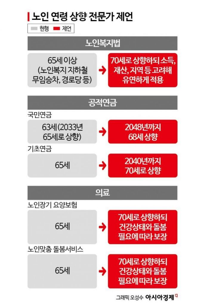 우리 사회의 노인 기준을 현행 65세에서 70세로 단계적으로 상향하고, 이에 맞춰 국민연금과 기초연금의 수급 개시 연령도 조정해야 한다는 제언이 나왔다. 전문가들은 초고령사회에 진입한 한국의 지속가능한 복지체계를 위해 국민연금은 2048년까지 68세로, 기초연금은 2040년까지 70세로 수급 연령을 올려야 한다는 데 의견을 모았다.