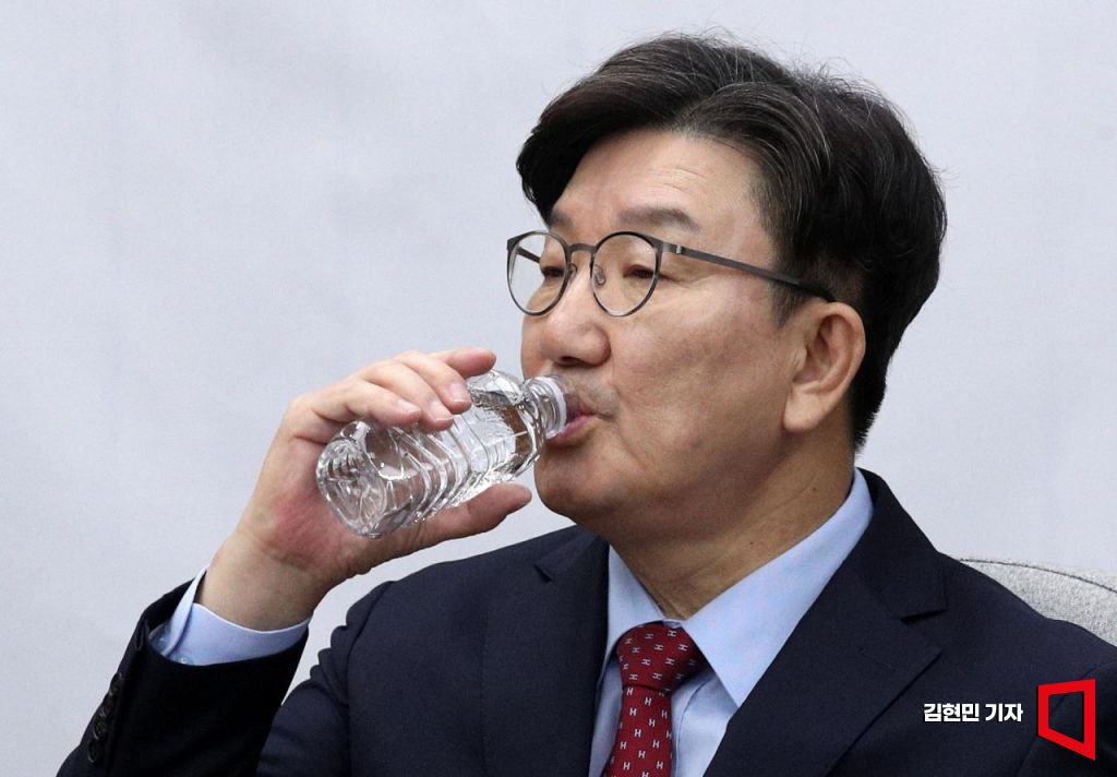 권성동 국민의힘 원내대표가 9일 국회에서 열린 원내대책회의에서 물을 마시고 있다.