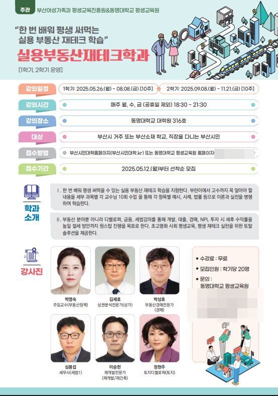 1학기는 5월 12일부터 부산시민대학 홈페이지 또는 동명대학교 평생교육원 홈페이지에서 접수 가능하다.