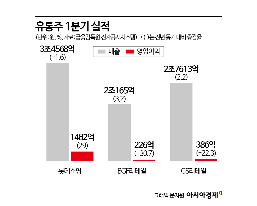 올해 1분기 실적에 따라 유통주들의 주가 희비가 엇갈리고 있다. 실적이 개선된 롯데쇼핑은 장중 52주 신고가를 기록한 반면 편의점 업체들의 주가는 기대에 못 미친 실적에 부진한 모습이다.
