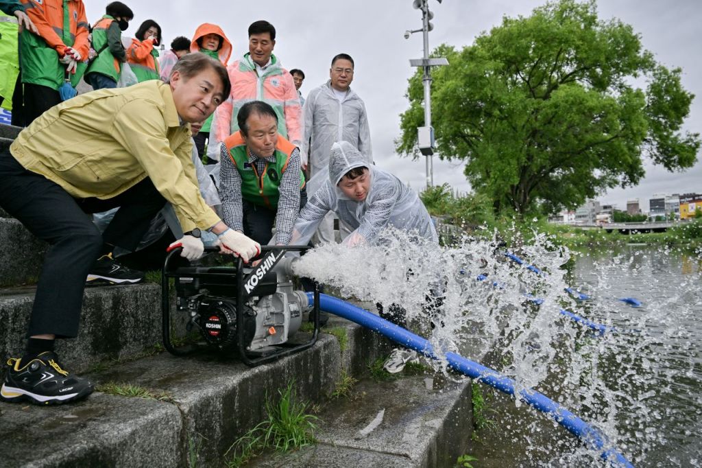 김이강 광주 서구청장이 9일 광주천변 광천2교 인근에서 서구자율방재단과 함께 수해 방지용 자동팽창마대 사용법과 양수기 작동법을 확인하는 등 '풍수해 대비 양수기 가동 민·관 합동훈련'을 실시하고 있다. 광주 서구 제공
