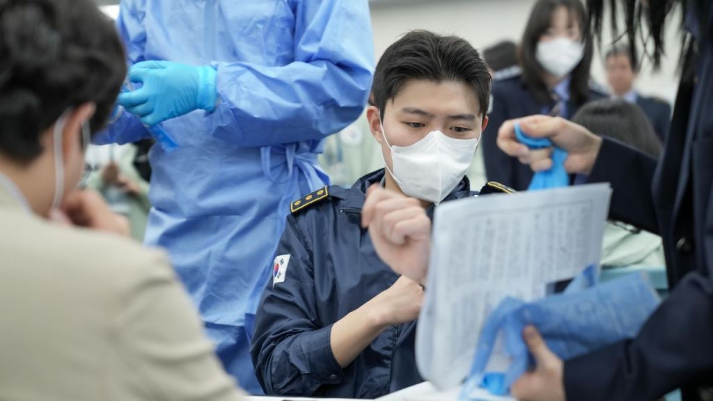 8일 오후 경남 김해국제공항 검역소에서 진행된 질병관리청의 '여행자 호흡기 감염병 검사 서비스' 시연에서 기자가 검역관 역할을 체험하고 있다. 질병관리청