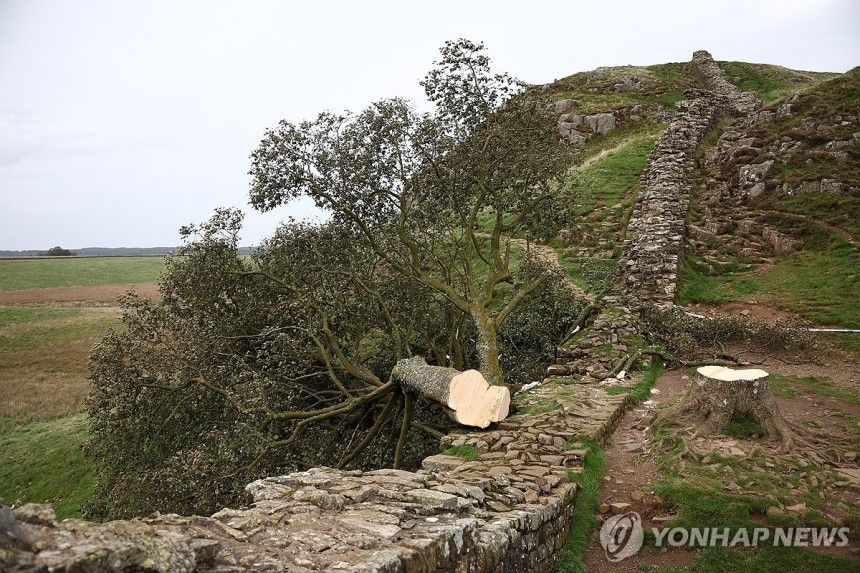 2023년 9월 시카모어 갭 나무가 절단돼 하드리아누스 방벽 위로 넘어간 모습 연합뉴스