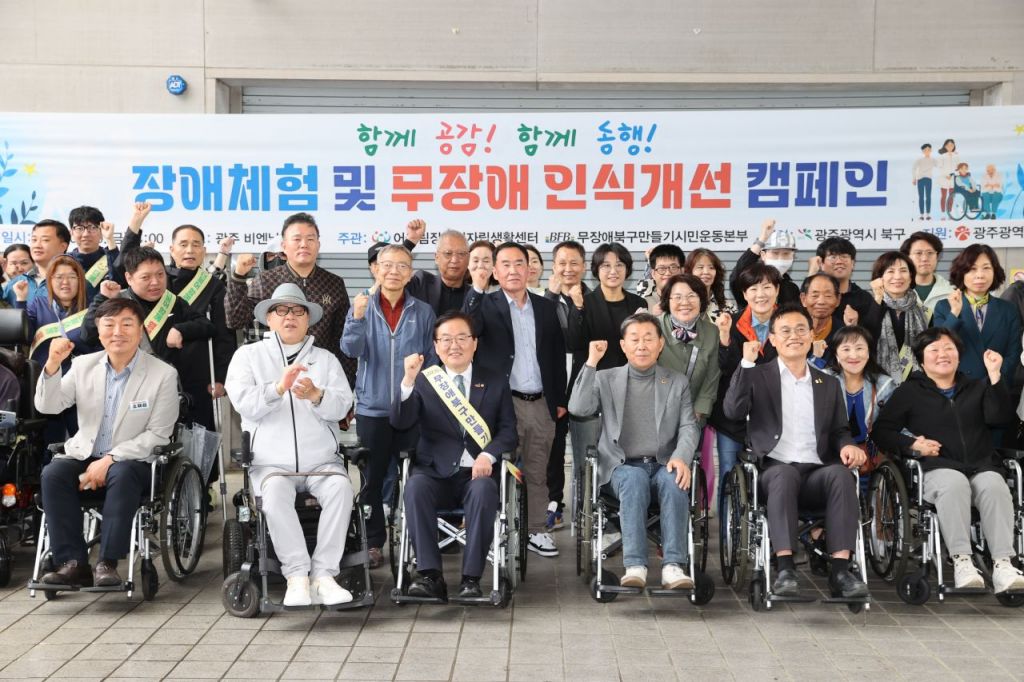 광주 북구는 지난 9일 무장애북구만들기 시민운동본부와 함께 비엔날레 전시관 야외 일원에서 장애 체험 및 무장애 인식개선 캠페인을 진행했다. 이날 문인 구청장을 비롯해 60여 명이 참여한 이번 행사에서는 휠체어 체험, 시각장애 체험 등을 통해 일상 속 장애 이해와 무장애 환경 조성의 중요성을 알렸다. 북구 제공