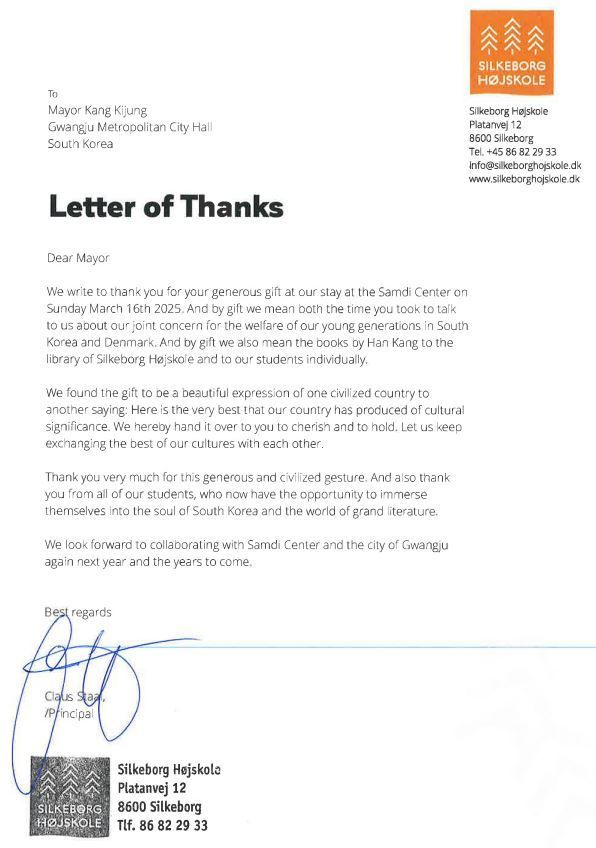 지난 3월 배움여행으로 광주를 찾은 덴마크 실케보르(Silkeborg) 시민학교 교사와 학생들이 강기정 시장의 환대와 한강 작가의 '소년이 온다' 등 책 선물에 감사의 뜻을 담은 편지를 광주시에 보내왔다.