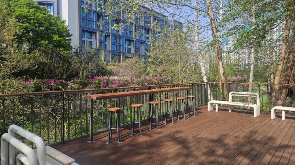 반포종합운동장과 심산기념문화센터를 잇는 반포천 산책로 구간에 데크 산책길을 조성하고, 길 곳곳에 5개의 쉼터를 조성해 산책과 휴식을 동시에 즐길 수 있는 힐링 공간으로 만들었다.