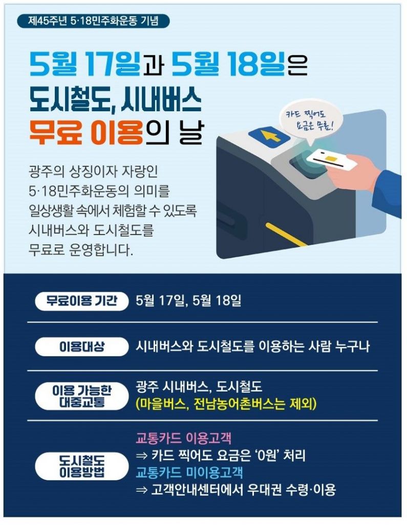광주교통공사(사장 조익문)는 제45주년 5·18광주민주화운동 기념일을 맞아 오는 17일과 18일 이틀간 광주도시철도 무료 승차를 실시한다고 11일 밝혔다.