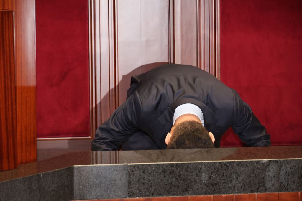 김문수 국민의힘 대선 후보가 11일 서울 여의도 국회에서 열린 의원총회에서 큰절을 하고 있다. 연합뉴스