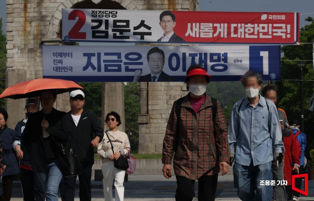 제21대 대통령선거 공식 선거운동 첫날인 12일 서울 서대문구 독립문 앞에 더불어민주당 이재명 후보와 국민의힘 김문수 후보의 현수막이 걸려 있다.