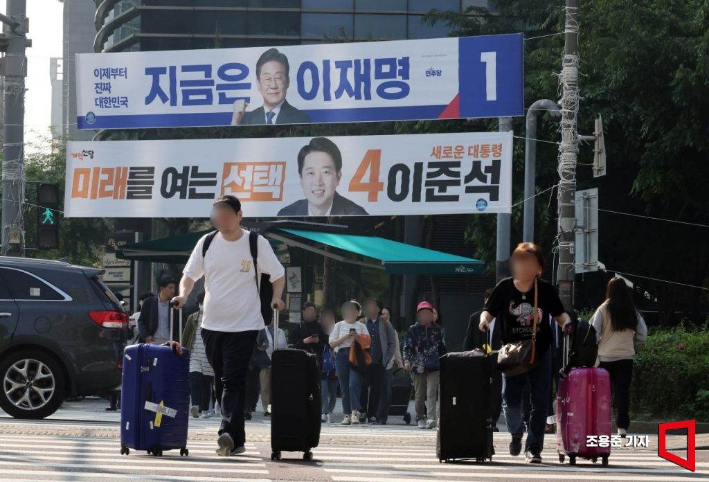 제21대 대통령선거 공식 선거운동 첫날인 12일 서울 마포구 공덕오거리에 더불어민주당 이재명 후보와 개혁신당 이준석