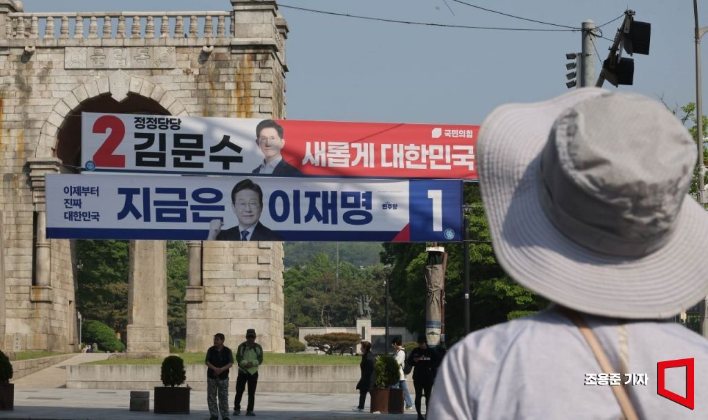 제21대 대통령선거 공식 선거운동 첫날인 12일 서울 서대문구 독립문 앞에 더불어민주당 이재명 후보와 국민의힘 김문수 후보의 현수막이 걸려 있다.