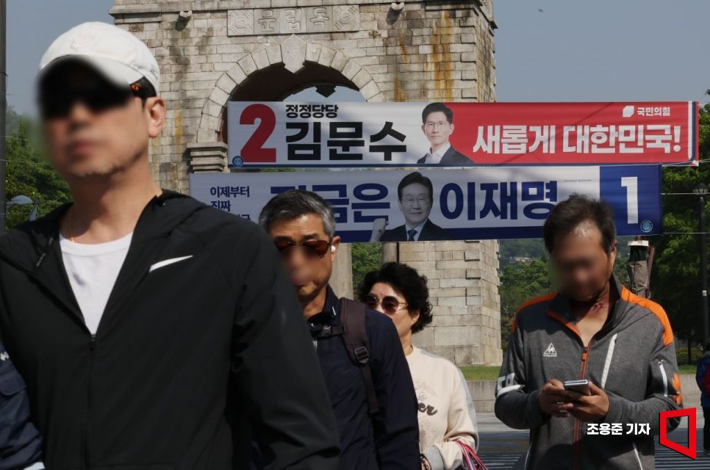 제21대 대통령선거 공식 선거운동 첫날인 12일 서울 서대문구 독립문 앞에 더불어민주당 이재명 후보와 국민의힘 김문수 후보의 현수막이 걸려 있다.