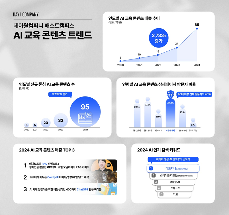 데이원컴퍼니 패스트캠퍼스는 2020년 5개에 불과했던 AI 강의 수는 지난해 152개로 30배 이상 증가했으며, 급변하는 AI 트렌드에 맞춰 95개의 AI 강의를 새롭게 열었다. 이에 따라 AI 강의 매출은 같은 기간 약 3억원에서 약 85억원으로 2733% 성장률을 기록했다.