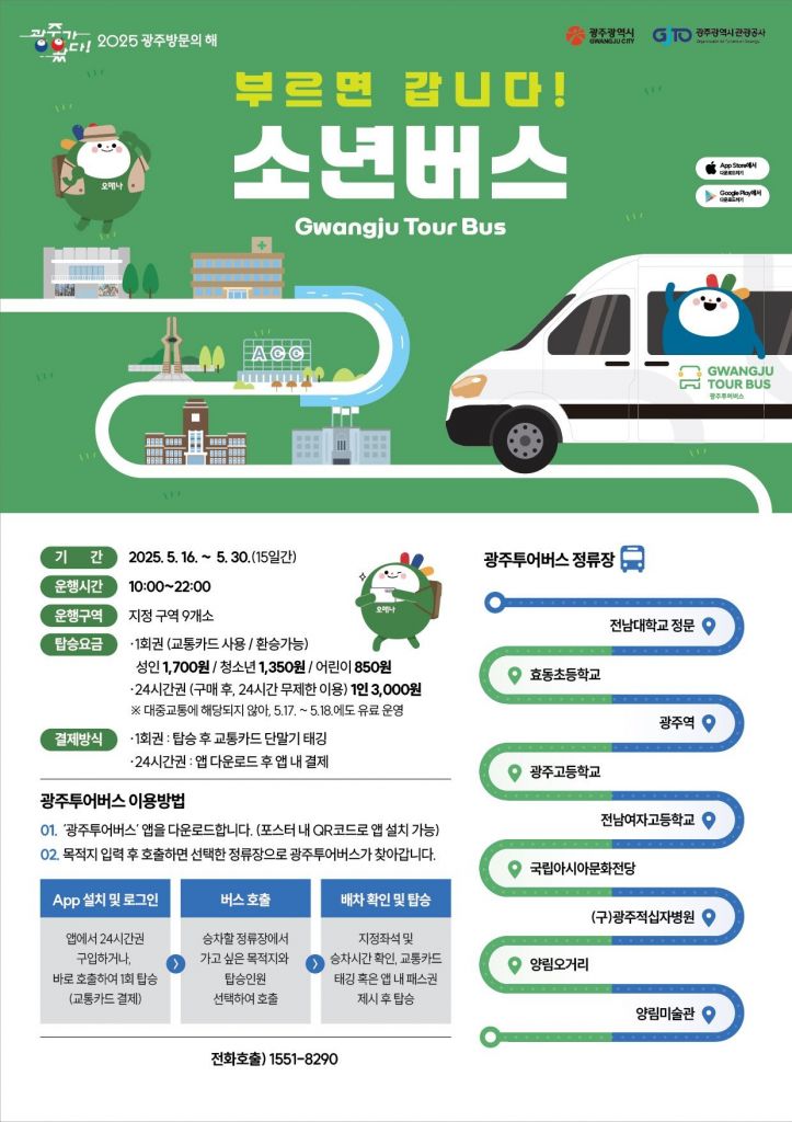 '소년 버스'는 이용자가 광주투어버스 앱을 통해 정류장을 선택하면 차량이 도착하는 수요응답형(DRT) 버스로, 시민과 관광객이 쉽게 이동하며 오월 광주를 체험할 수 있도록 구성됐다.