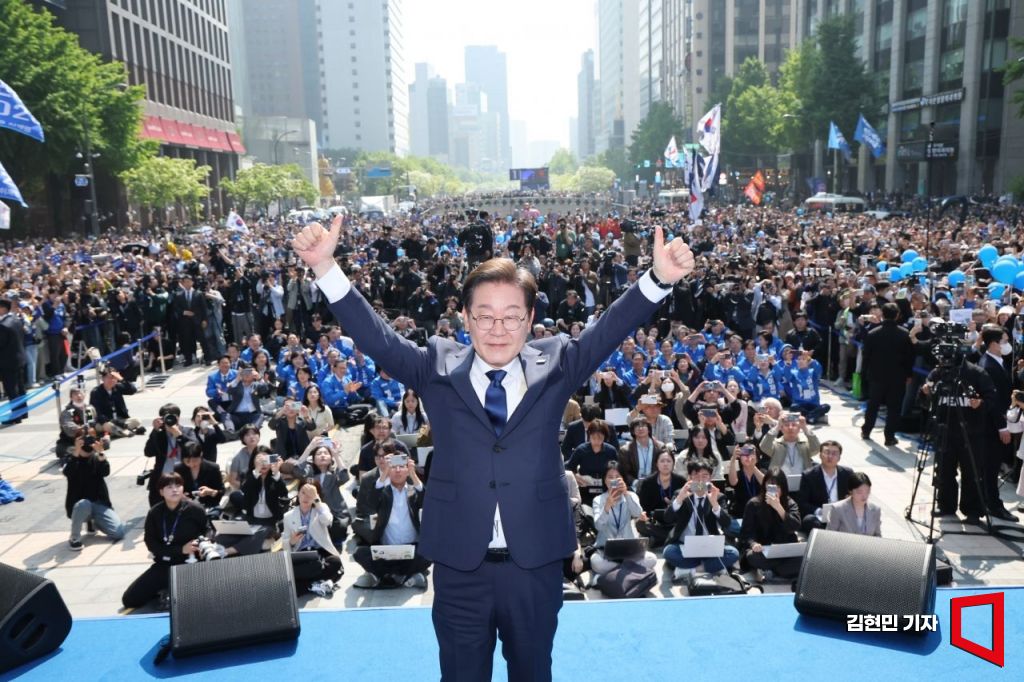 [포토] 이재명 등장하자 청계광장 함성 가득…'빛의 광정'서 대선 출격