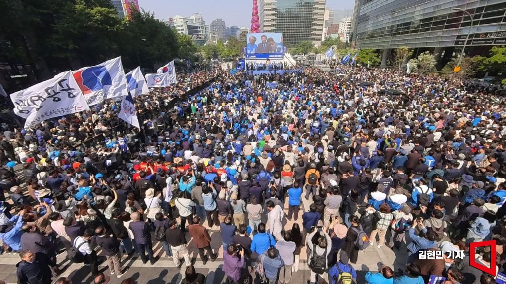 제21대 대통령선거 공식 선거운동 첫날인 12일 서울 광화문 청계광장에서 열린 더불어민주당 이재명 대선 후보의 출정식 및 첫 유세에서 유권자들이 후보 연설을 듣고 있다.