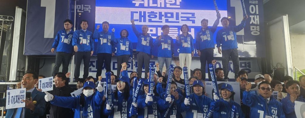 6·3 제21대 대통령선거 공식 선거운동 첫날인 12일, 더불어민주당 광주 서구을 지역위원회가 거리 유세 출정식을 열고 이재명 후보 지지를 호소하고 있다. 선대위 관계자들과 지지자들이 구호를 외치며 본격적인 선거전에 돌입한 모습이다. 신동호 기자