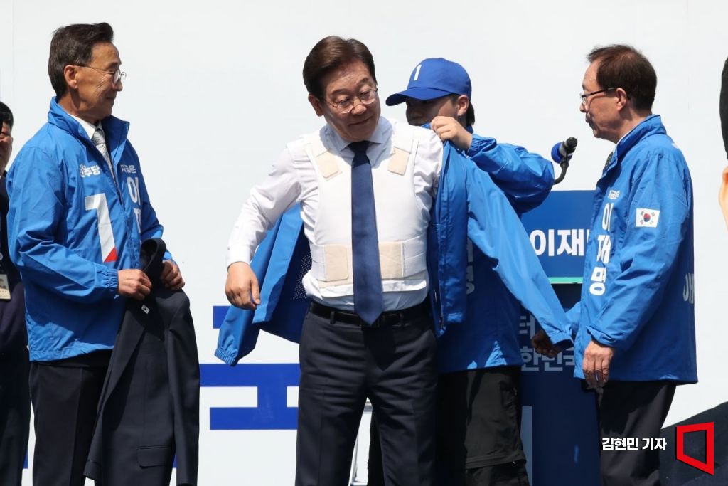이재명 더불어민주당 대선 후보가 제21대 대통령선거 공식 선거운동이 시작된 12일 서울 종로구 청계광장에서 열린 중앙선거대책위원회 출정식에서 방탄복 위에 선거 운동복을 입고 있다. 김현민 기자