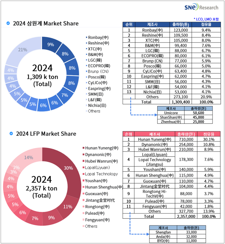 한국의 LG화학은 8만8000t으로 5위에 올랐으며 에코프로(에코프로비엠·에코프로이엠)가 8만t으로 6위를 기록했다. 에코프로는 지난 2023년에는 12만t을 공급하며 1위를 기록한 바 있다. 포스코퓨처엠은 6만6000t을 공급하며 8위에 올랐다. 2023년 8만5000t을 출하하며 4위에 올랐던 엘앤에프(L&F)는 2024년에는 출하량 5만4000t으로 12위로 떨어졌다.