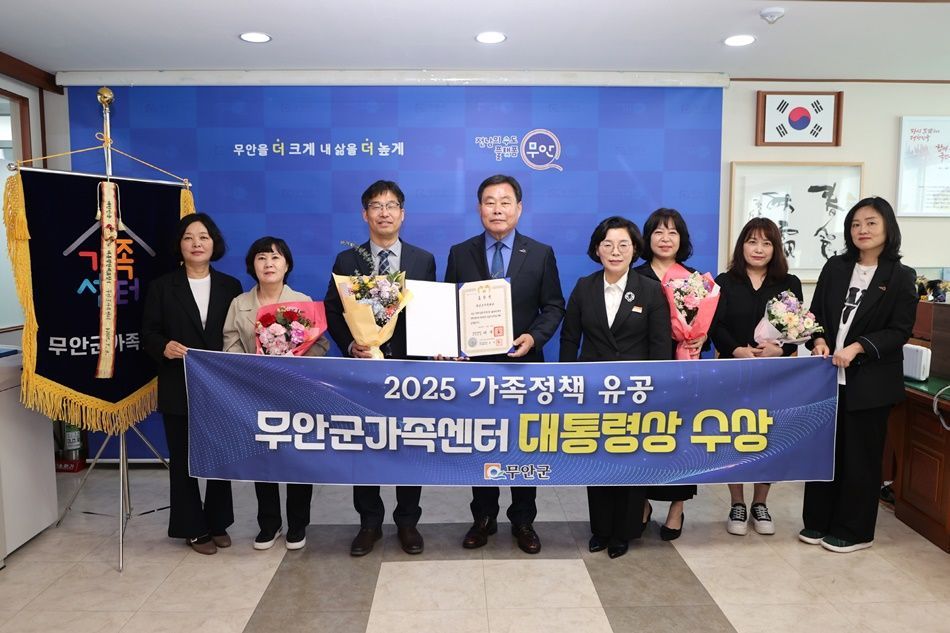 전남 무안군가족센터(센터장 정준수)가 지난 8일 여성가족부 주관 2025년 가정의 달 기념행사에서 가족정책 분야 대통령상을 받았다.