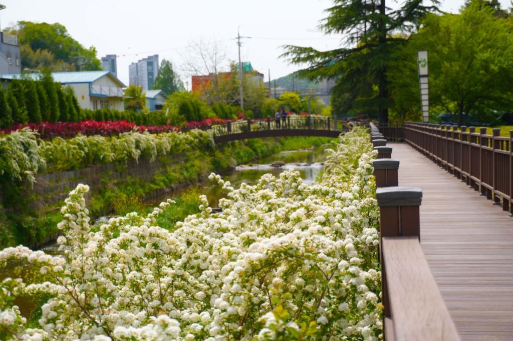 보성군 동윤천을 따라 조성된 산책로를 따라 공조팝나무가 흐드러지게 피어있다. 보성군 제공