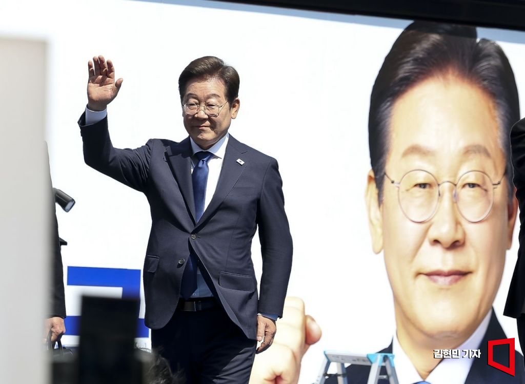 이재명 더불어민주당 대선 후보가 12일 서울 중구 청계광장에서 열린 중앙선거대책위원회 출범식 및 첫 유세에서 지지자들을 향해 손을 흔들고 있다. 김현민 기자