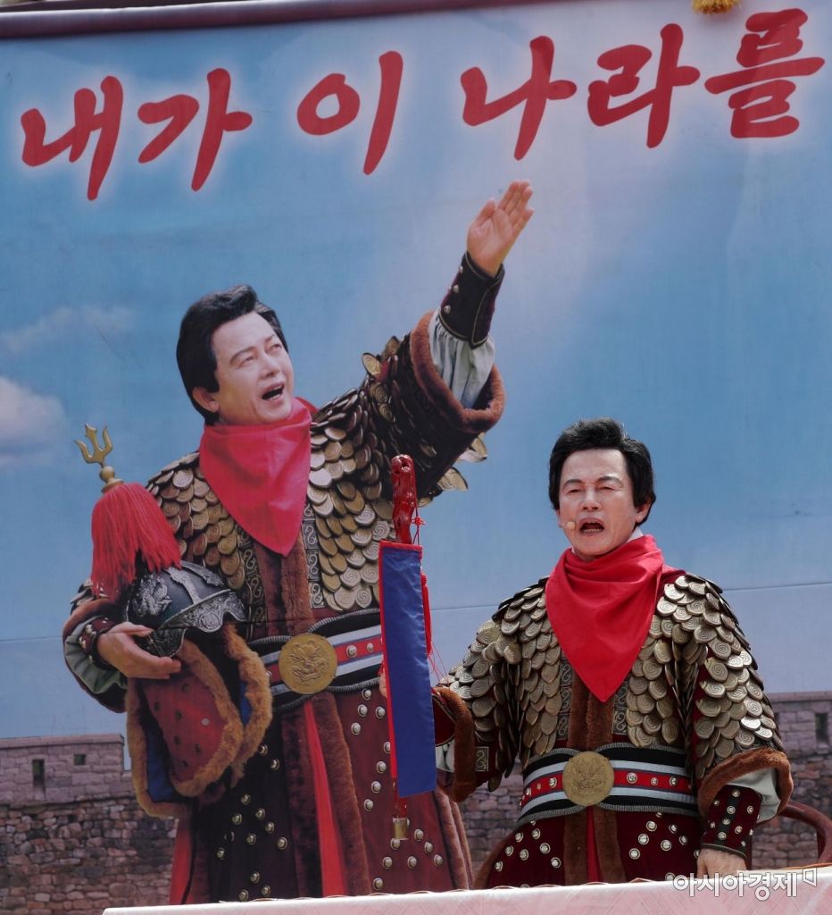 허경영 국가혁명당 명예대표가 지난 2021년 경기 고양시 행주산성 대첩문 앞에서 대선 출마 선언식을 열고 퍼포먼스를 하고 있다.김현민 기자