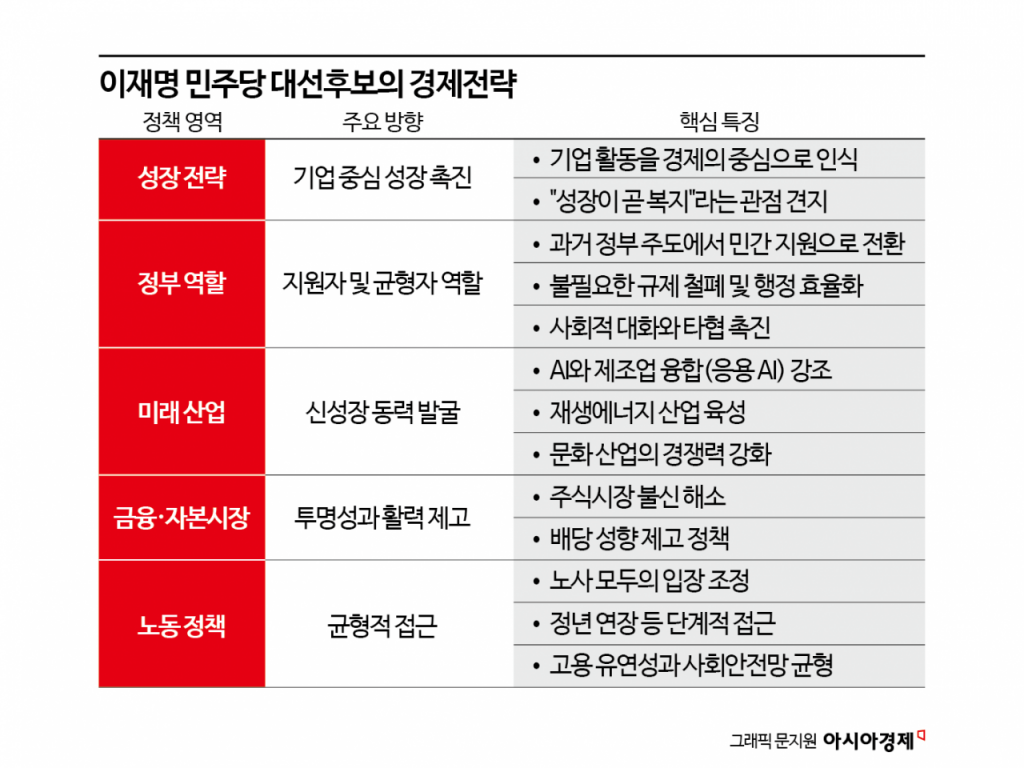 과거 민주당 대표 시절 경제계 단체들과의 회동, 최근 경제 5단체장 간담회 발언 내용, 이번 대선 10대 공약 등을 통해 이 후보의 성장 전략을 분석해 봤다. 이 후보는 지난해 8월 민주당 전당대회를 기점으로 실용주의, 친기업 색채를 한층 강화했다. 기업, 노동 등과 관련해 민주당의 '도그마'와 같던 부분들을 깨는 노력이 이어졌다. 경제 관련 언급에서는 친시장 실용주의 색채가 강하게 배어 있다.