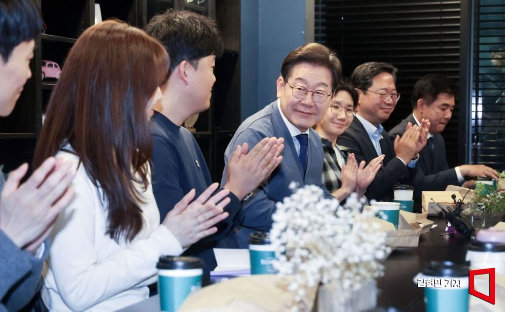 이재명 더불어민주당 대선 후보가 12일 경기 성남시 판교의 한 오피스텔에서 'K-혁신' 브라운백미팅에 참여해 판교 IT개발자 2030 직장인들과 간담회를 하고 있다.