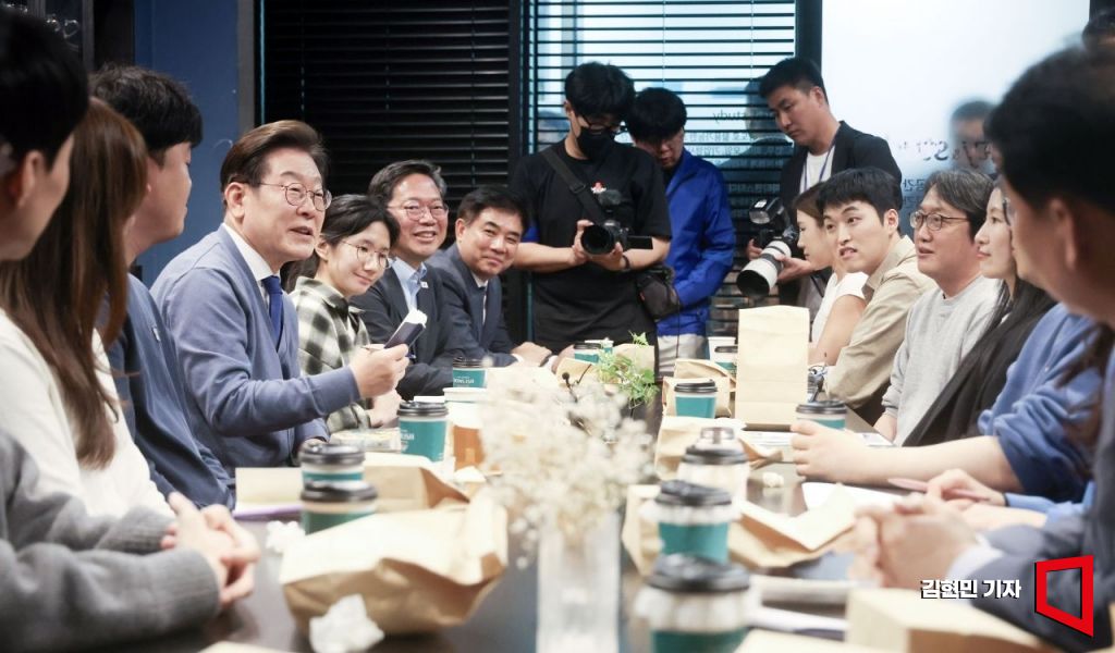 이재명 더불어민주당 대선 후보가 12일 경기 성남시 판교의 한 오피스텔에서 'K-혁신' 브라운백미팅에 참여해 판교 IT개발자 2030 직장인들과 간담회를 하고 있다.